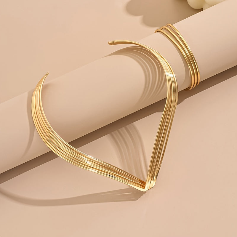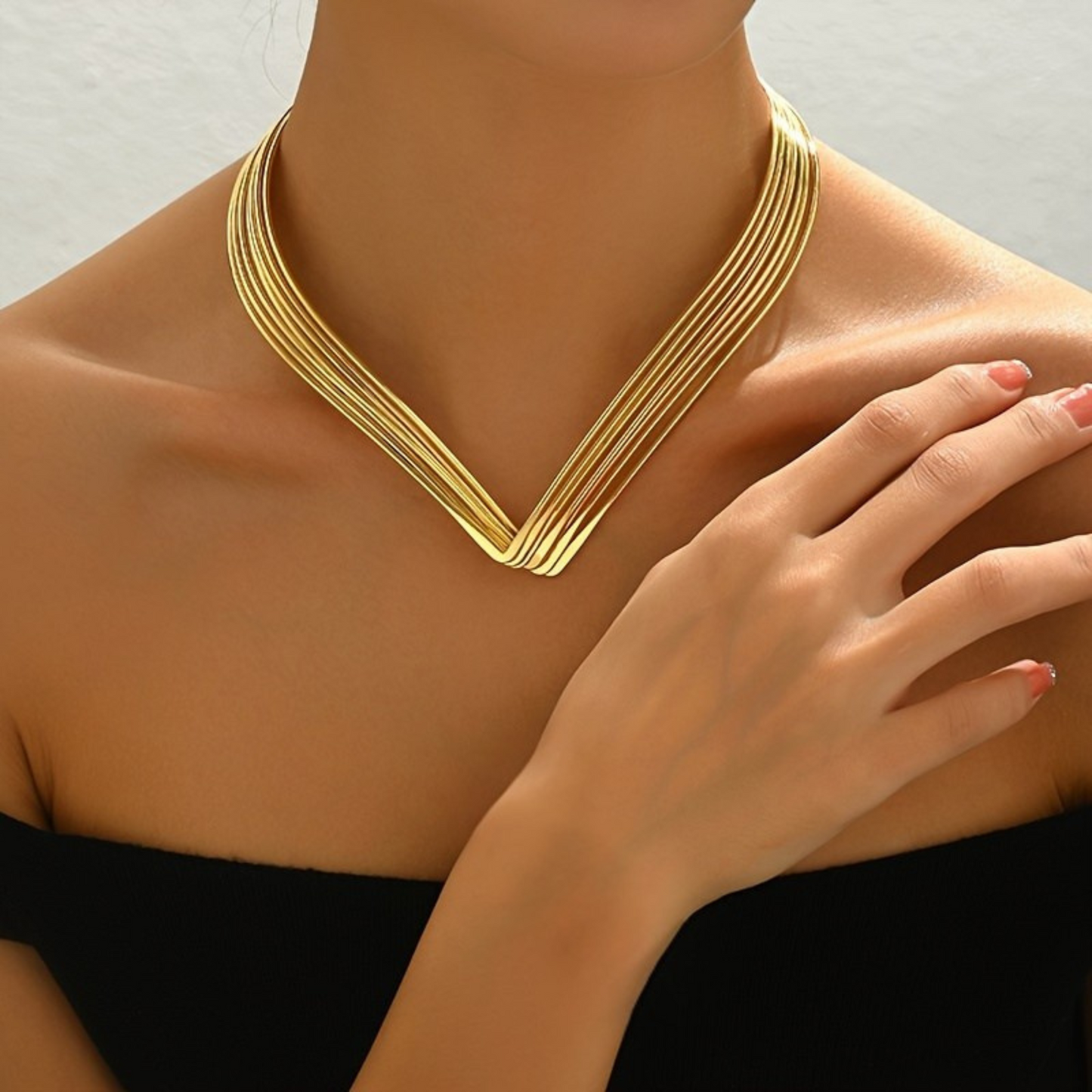 שרשרת הצהרה בגימור זהב מבריק, עם עיצוב גיאומטרי מרובד שמחבק את הצוואר באלגנטיות יוצאת דופן. תתכונני לכבוש כל חדר בנוכחות חזקה והמון עוצמה במראה שלך.