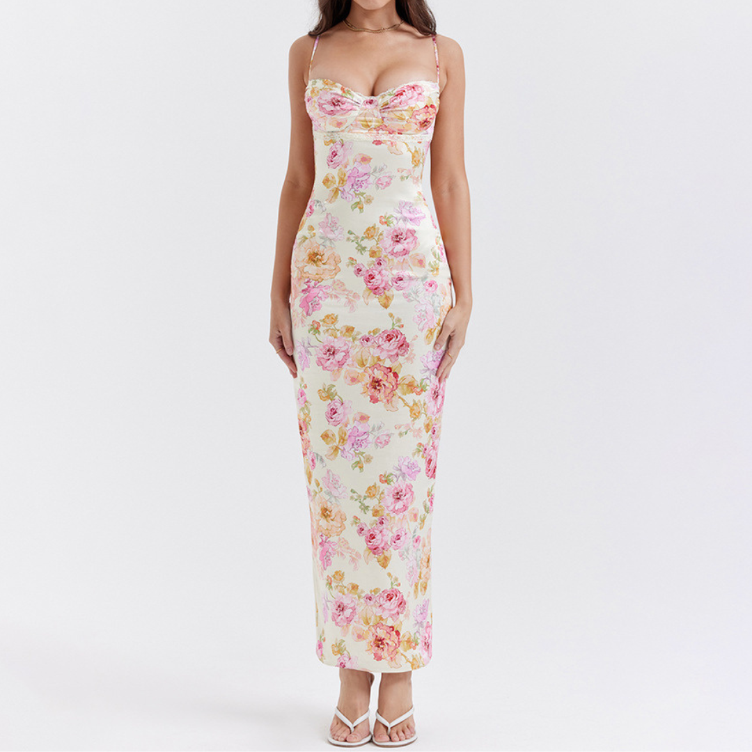 שמלת מקסי מהפנטת בגזרה מחמיאה ומושכת, מבד סאטן בורק וסטרצ'י עם פרינט פרחוני קסום, כתפיות דקות ושסע מחמיא בחלקה התחתון להשלמת המראה המושלם.